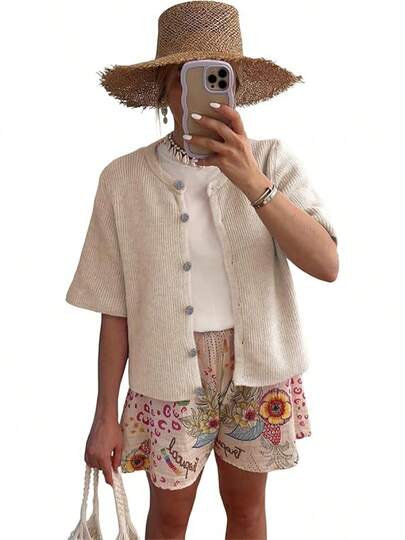 Cardigan sweaters for women lightweight This women's casual short-sleeve cardigan is made from a premium, soft knit fabric. It is lightweight, cozy, comfortable, and breathable, ensuring a gentle touch against your skin cardigan features a button-down front, short sleeves, and a classic round neckline. It comes in a solid neutral color, offering a versatile and timeless look Pair this cardigan with ruffled skirts, jeans, shorts, or layered over dresses. neutral tone allows for easy styling with different accessories and footwear, perfect for creating an elegant, everyday look Ideal for various occasions, this basic yet stylish cardigan is suitable for daily wear, casual outings, shopping, office, vacation, or even as a light layer for cool summer evenings. It's a versatile piece that transitions seamlessly through spring, summer, and fall