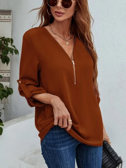 6. SHEIN LUNE Half Zipper Roll Tab Sleeve Blouse