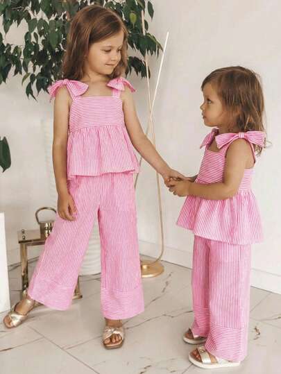 SHEIN 2pcs Young Girl Woven Striped Camisole Top And Pants Set - Multicolor - View 1