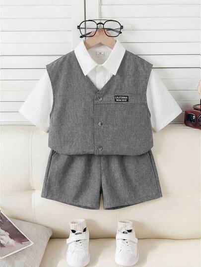 SHEIN 3pcs/Set Young Boys/Girls Casual Korean Style Side Pocket Sleeveless Vest, Striped Short Sleeve T-Shirt And Shorts 3-Piece Outfit, Suitable For First Day Of School, School Clothes, Crew Neck Sweatshirt, School Kids Clothes, Boys Kids Outfits, Toddler Boy Clothes, Back To School Boys Set, Boys Outfits, Suitable For Daily Wear, School, Outings, Sports, Spring/Summer Outfits Y2k Vacation Tendencias Ss26 Streetwear Burgundy Holiday Vintage Boho Festival Gras Party Cute Birthday Boys Modest Casual C