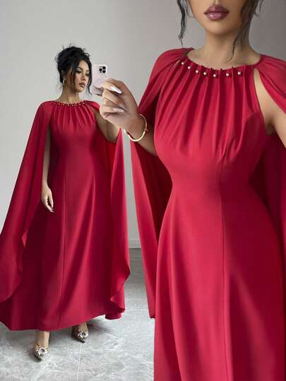 SHEIN Raffinéa Women's Elegant Party Banquet Beaded Pleated Cape Sleeve Waist Cinched Dress - Red - View 1