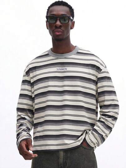 SUMWON Horizontal Striped Long Sleeve Crew Neck Tee Regular Fit Jersey Casual Everyday Wear Fall Winter Layering Basic - Multicolor - View 1