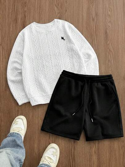 SWAVVY Men's Crew Neck Long Sleeve Casual Loose Pullover Sweatshirt Set Black White Short Set Men - Black and White - View 1