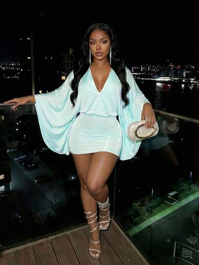 Slaydiva Elegant Mint Blue Deep V Batwing Sleeve Loose Bodycon Mini Dress - Suitable For Valentine's Day Date, Vacation - Mint Blue - View 1