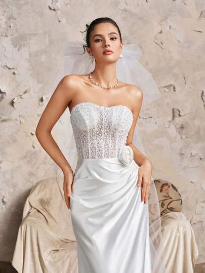 Sleeveless Off-Shoulder Beaded Wedding Dress With 3D Rose And Ruffle Details, Elegant Woven Maxi Dress Suitable For Parties And Romantic Events - White - View 3