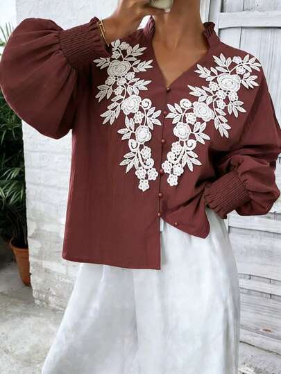 Spring New Vintage Elegant Women's Shirt: Rust Red V-Neck Cardigan With Button, Puff Sleeves And White Embroidered Design, Retro Chic, Loose Fit H-Line For Vacation & Leisure - Burgundy - View 1