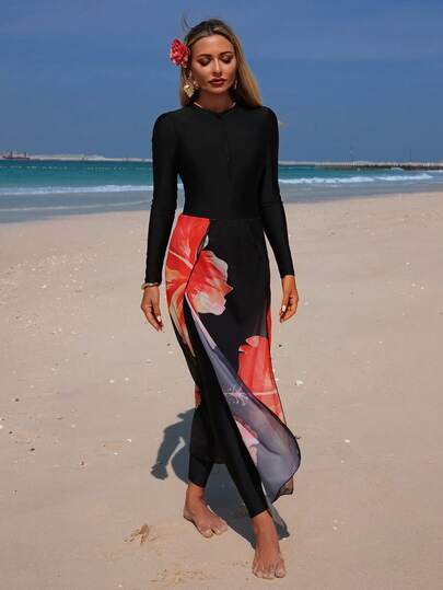 Swim Shayni New Black Long Sleeve Swimsuit With Red Floral Print Mesh Skirt Overlay, 2-Piece Set - Multicolor - View 1