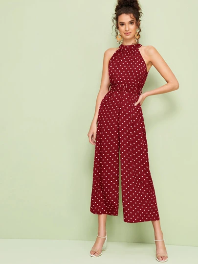 Wide Leg Polka Dot Belted Halter Jumpsuit - Burgundy - View 1