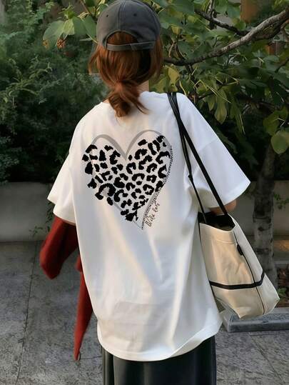 Women's Casual Round Neck Loose Fit Heart & Leopard Print Letter Graphic Short Sleeve T-Shirt, Spring/Summer - White - View 1