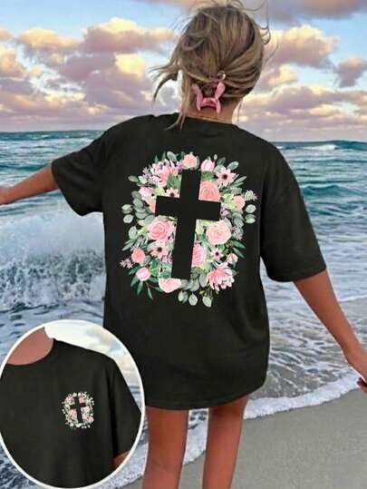 Women's Loose T-Shirt With Floral Cross Pattern On Back | Country Style Aesthetic, Bohemian Loose Fit, Drop Shoulder Design, Comfortable Fashionable Streetwear Casual Vacation Black Summer