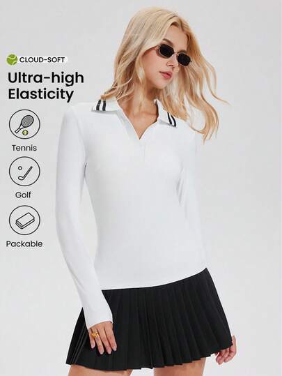 Women's Sporty Long Sleeve Polo Shirt, Casual Colorblock Striped Collar Golf Outdoor Tennis Tee, Stretchy & Elegant - White - View 1
