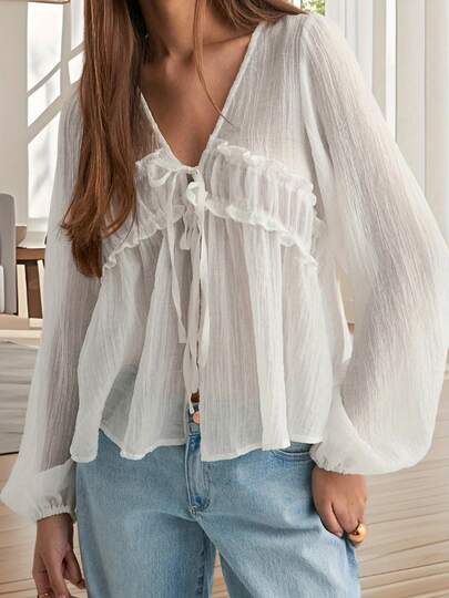 Womens Tie-Up Front Tops Long Sleeve V Neck Loose Fit Ruffle Shirts Spring Crincle Blouses - White - View 1