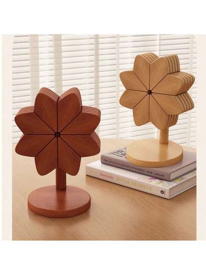 Wooden Heat-Insulating Bowl Mat, Trivets, And Flower Coaster Set With Stand. Creative Windmill-Shaped Heat-Insulating Potholders, Heat-Resistant And High-Quality Coasters And Potholders For Your Dining Table. - Multicolor - View 1